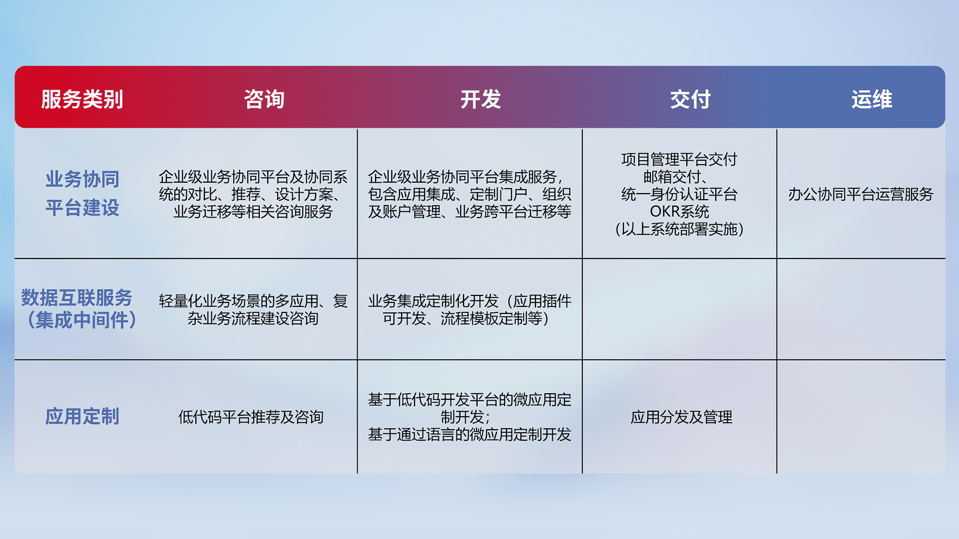 针对钉钉、、企微、、、、IDaas等平台级产品提供产品的规划、、方案、、、、交付、、、、定制化开发等服务,,,,实现如统一协同办公、、、、智能客户服务、、、混合会议管理、、、、智能数据查询、、、、等业务场景,,实现数字化转型。。。。