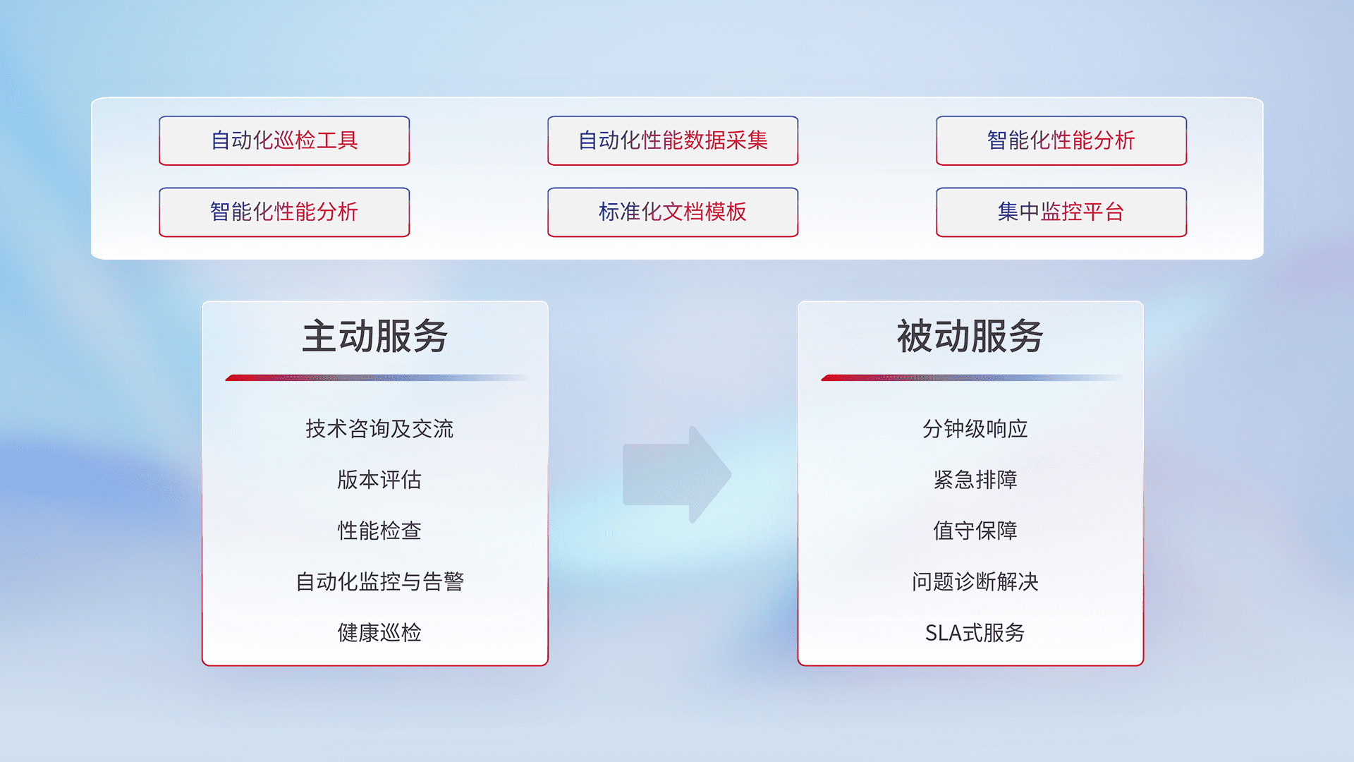 智能化工具和标准化文档,,,,保障服务质量,,提供主动服务(包含技术咨询、、版本评估、、、、性能检查、、自动化监控与告警、、健康巡检)和被动服务包含(分钟级响应、、、紧急排障、、、、值守保障、、、、问题诊断解决、、SLA服务)。。。。